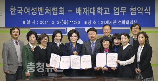 배재대학교(총장 김영호·왼쪽 여섯 번째)와 한국여성벤처협회 대전충청지회(회장 김영휴·왼쪽 다섯 번째)는 27일 오전 대학 전략회의실에서 양 기관 관계자들이 참석한 가운데 산학협력 협약을 체결했다.