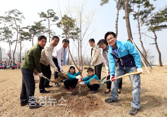유성구(구청장 허태정)는 28일 관평동 동화울수변근린공원에서 ‘2014 봄철 행복나무심기’ 행사를 개최했다.