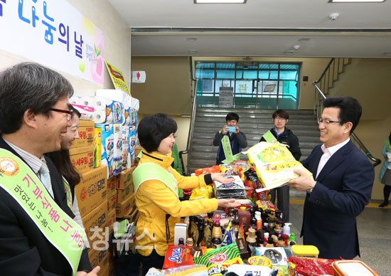 유성구는 4일 구청 로비에서 공무원들이 출근길에 1인당 하나씩 가져온 쌀과 라면, 식용류 등 각종 식료품을 기부하는 ‘기부식품 나눔의 날’ 행사를 가졌다.