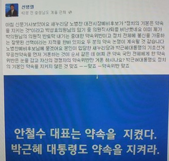 끝으로 선 후보는 “노병찬 후보에게 박근혜 대통령의 기초선거 무공천 공약 약속 불이행에 대한 입장을 밝혀주실 것을 촉구한다”고 말했다.