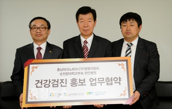 충남테크노파크(원장 윤창현·충남TP)는 지난 7일 순천향대학교부속 천안병원(병원장 이문수)과 충남TP, CTP경영자협회(회장 김두철)간 임직원들의 복지향상을 위한 건강검진 홍보 업무협약을 체결했다.