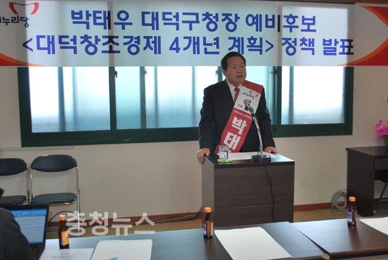 새누리당 박태우 대덕구청장 예비후보는 8일 오후 ‘대덕창조경제 4개년 계획’ 제1차 정책 발표를 가졌다. 박태우 후보는 이날 대덕구 중리동 선거사무실에서 “연축지구 도시개발사업의 중심에 젊음의 도시, 문화의 도시, 행정타운의 신도시건설을 통한 대덕 30만신도시 프로젝트를 핵심 사업으로 추진시키겠다”고 약속했다.