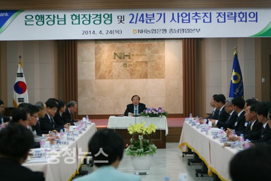 NH농협은행 김주하 은행장은 24일 충남영업본부 대회의실에서 개최된 '2014년도 2/4분기 사업추진 전략회의'에 참석, 충남관내 사무소장과 직원들을 격려하고 특강을 통해 '현장·소통·밀착 경영'을 강조했다.