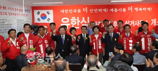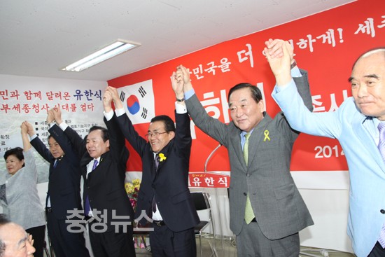 서청원 중앙선대위 공동위원장은 “어려움을 딛고 새로운 희망을 일으킬 분은 박 대통령이다. 박 대통령과 함께 유 후보가 세종시를 지켰다”며 “박 대통령과 유 후보가 세종시를 더욱 발전시킬 수 있도록 만들어 달라”고 지지를 호소했다.