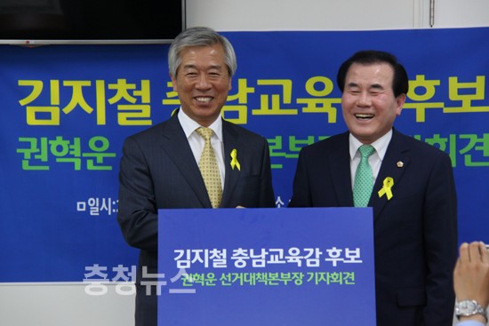 김지철 충남교육감 후보와 권혁운 선대본부장은 26일 충남도교육청에서 공동기자회견을 갖고, “서로 살아온 길은 다르지만, 청렴하고 올곧게 살아온 대다수 교직원들의 실추된 명예를 회복하기 위해 힘을 합쳤다”고 밝혔다.