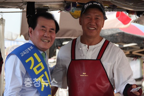 김지철 충남교육감 후보가 지난 30일 천안 중앙시장에서 어르신들을 찾아 유세를 벌였다.