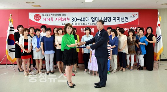 박성효 대전광역시장 후보 선대위 네트워크전략본부(본부장 조신형)는 지난 30일 선거사무소에서 아이를 사랑하는 30~40대 엄마들의 지지선언 행사를 가졌다. 이 날 행사에는 대전에 거주하는 30~40대 주부 30여 명이 참석했으며, 지지선언문 낭독 후 대전시 엄마들 1천명의 명단을 전달했다.