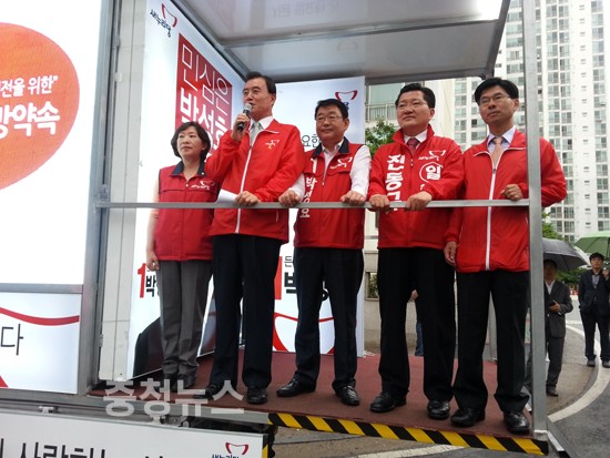 이날 노은동 열매마을 8단지 앞에서 열린 유세에서 홍문표 국회예산결산위원장과 박성효 시장 후보와 진동규 구청장 후보, 박종선 시의원 후보와 이홍기,이애리 구의원 후보의 지원유세를 펼쳤다