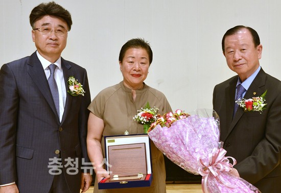 ▲ 배재대학교 개교 129주년 기념식에서 배재학당 황장남 이사장(사진 오른쪽)과 배재대 김영호 총장(사진 왼쪽)이 배재대 대학원 최고경영자과정 총동문회 한영미 회장(사진 가운데)에게 감사패를 전달하고 있다.