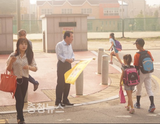 김지철 충남교육감 당선인은 24일 아침 아산 온양온천초등학교 앞에서 충남도의회 이기철 의원과 함께 등굣길 교통지도로 학생들을 맞았다.