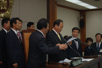이날 중심당소속 의원들은 임시 의장의 회의 진행 과정에 이의를 제기하며 단상에서 내려와 투표함을 가로막고 투표 진행을 방해하는 등 조직적으로 의사진행발언 정회를 요구하며 한나라당의 합의 후 회의 속개를 강하게 요구했지만 이창배(서산1) 임시의장이 ‘제43조 의사진행관련 법령’을 제시하며 의사진행발언요구 자체를 거부하고 강행처리했다.