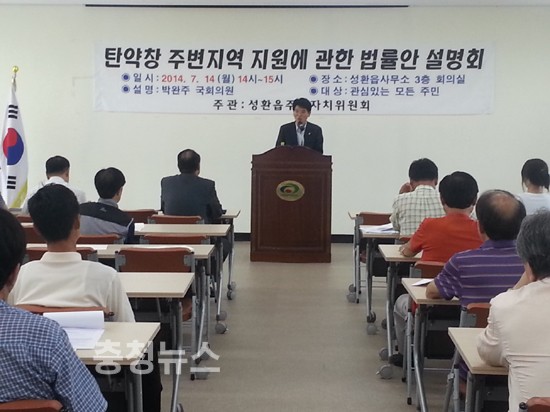 새정치민주연합 박완주의원(천안을)은 14일 오후 천안시 서북구 성환읍회의실에서 주민대표 100여명이 참여한 가운데 주민자치위원회(위원장 남기성) 초청 ‘탄약창 주변지역지원법 설명회’를 가졌다. 천안시 서북구 제3탄약창은 1963년 폭발물 안전거리 확보를 이유로 정부가 1229만㎡를 군사시설보호구역으로 지정해 주민들은 재산권조차 제대로 행사하지 못하는 등 큰 피해를 입어왔다.