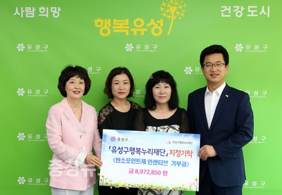 대전시 유성구는 15일 구청 행복사랑방에서 허태정 유성구청장 및 그린린더, 행복누리재단 관계자 등이 참석한 가운데 탄소포인트제 인센티브 기부모금액 기탁식을 가졌다.
