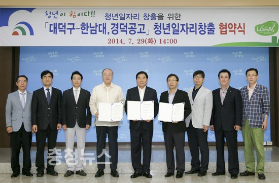대덕구(구청장 박수범)는 29일 오후 구청 중회의실에서 김형태 한남대학교 총장과 이판희 경덕공업고등학교장이 참석한 가운데 2012년에 이어 학․관 청년일자리창출 협력기관 업무 협약식을 갖고 일자리 창출을 위해 상호 협력하기로 했다.
