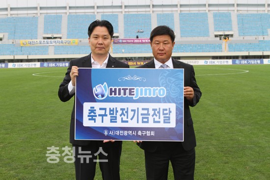 하이트진로는 이날 대전광역시축구협회가 주관하는 “2014 IBK 기업은행 WK리그” 축구경기 개최에 앞서 대전지역 축구관계자가 참석한 가운데 기금 전달식을 가졌다.