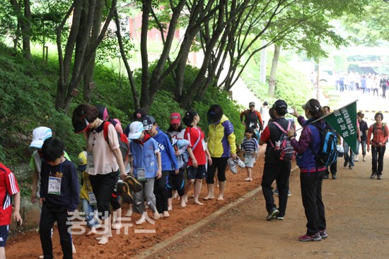 ▲ 2013년 가족생태캠프 참가자들이 계족산 황톳길 체험을 하고있다.