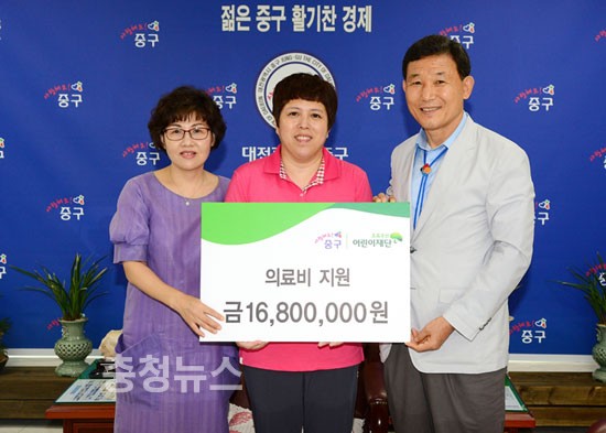 대전시 중구(구청장 박용갑)와 초록우산 어린이재단(대전지역본부장 최명옥)은 지난 19일 희귀질환을 앓고 있는 송정원(8세) 아동가정에 ‘SBS 세상에서 가장 아름다운 여행’ 방송을 통해 모금된 후원금을 전달했다.