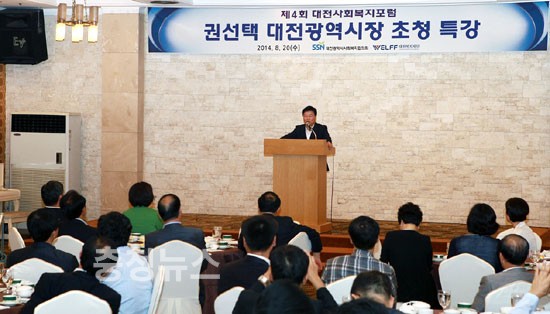 대전복지재단과 대전사회복지협의회가 공동주최한 가운데 유성호텔에서 개최된 「대전사회복지포럼」특강에서 권시장은“특히 사회복지종사자들의 사기진작과 처우개선을 위해 급여체계의 현실화 및 근무환경 개선 등 다각적인 방안을 적극 모색해 나가겠다.”고 강조했다.