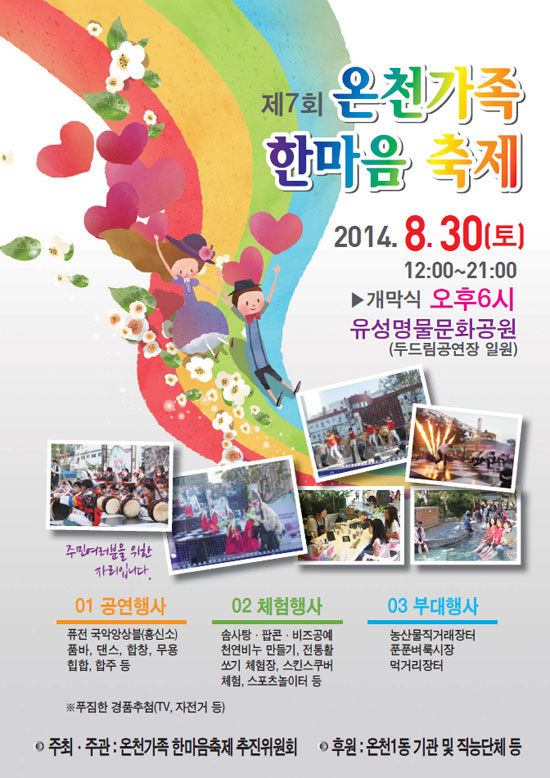 온천가족 한마음축제 추진위 주관으로 열리는 이번 행사는 낮 12시부터 저녁 9시까지 다채로운 체험과 공연, 부대행사가 진행된다.