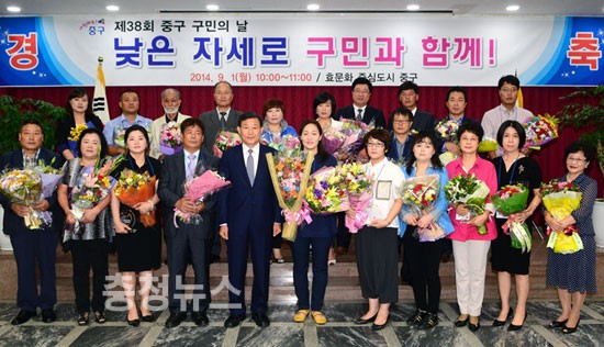 대전시 중구(구청장 박용갑)는 1일 구청 대회의실에서 권선택 대전시장과 노인회장, 봉사단체 회원 등 200여 명을 초청한 가운데 제38회 구민의 날 기념식을 개최했다.