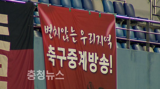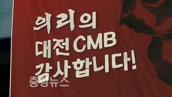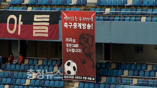 대전시티즌 서포터즈 퍼플크루에서 CMB대전방송의 프로축구 중계에 대한 고마움의 표시로 대형 현수막을 내걸어 화제를 모으고 있다.