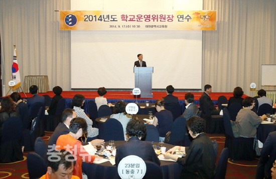 대전시교육청(교육감 설동호)은 17일 유성리베라호텔(2층 다이너스티홀)에서 각급학교 운영위원장 290명을 대상으로「2014년도 학교운영위원장 연수」를 실시했다.
