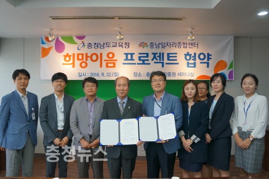 충남경제진흥원(원장 고경호)에서 운영하는 충남일자리종합센터가 22일 재단 세미나실에서 희망이음 프로젝트에 대한 업무 협약을 충청남도 교육청(교육감 김지철)과 체결했다.