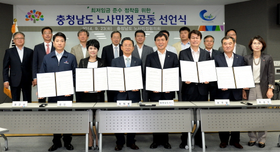 충남도 노사민정협의회는 23일 천안 고속버스터미널 4층에서 제2차 협의회를 개최하고, ‘최저임금 준수 정착을 위한 충청남도 노사민정 공동선언문’을 발표했다.