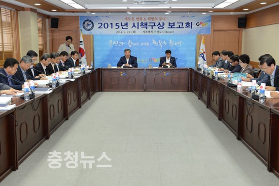 부여군은 지난 23일 군청 브리핑실에서 이용우 군수 주제로 실과소장, 읍면장 등 40여명이 참석한 가운데 새로운 변화와 희망의 부여를 위한 2015년도 시책구상 보고회를 가졌다.