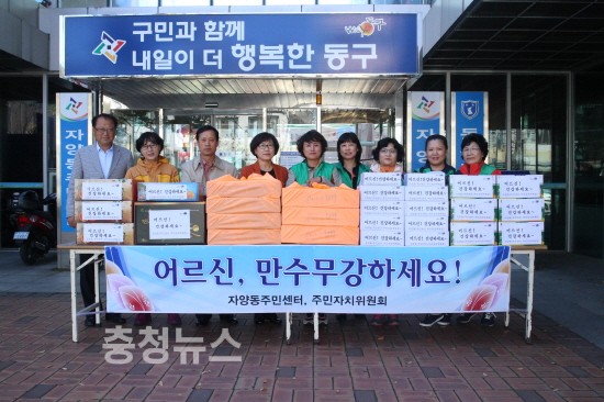 동구 자양동 주민센터(동장 지현목)가 경로의 달을 맞아 16일 관내 5개 경로당에 떡과 과일, 음료수 등을 대접하는 효 나눔 행사를 가졌다. 자양동 주민센터와 주민자치위원회(위원장 안경호) 주관으로 같이 준비한 이날 행사는 지역 발전의 중추적 역할을 해온 어르신들의 노고에 감사드리고 경로효친 사상을 고취하기 위해 마련했다.