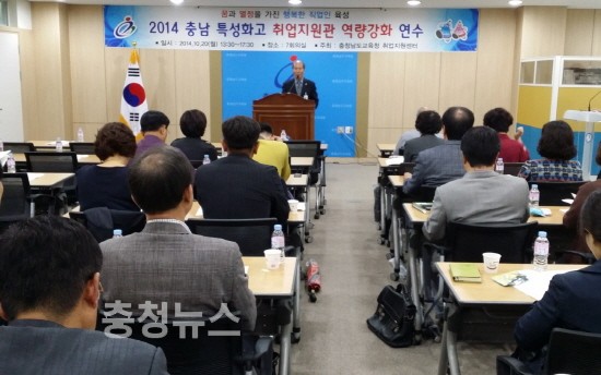 충남도교육청(교육감 김지철)은 20일 도내 특성화고․마이스터고 취업지원관 35명을 대상으로 ‘2014 충남 취업지원관 역량강화 연수’를 실시했다. 이날 연수는 도교육청 취업지원센터 담당 장학사가 취업지원관의 역할 및 정부 정책에 따른 특성화고 학생들의 취업전략을 소개하고, 우수 취업처 발굴 및 취업지도 노하우 공유를 통한 취업률 제고를 위해 추진됐다.