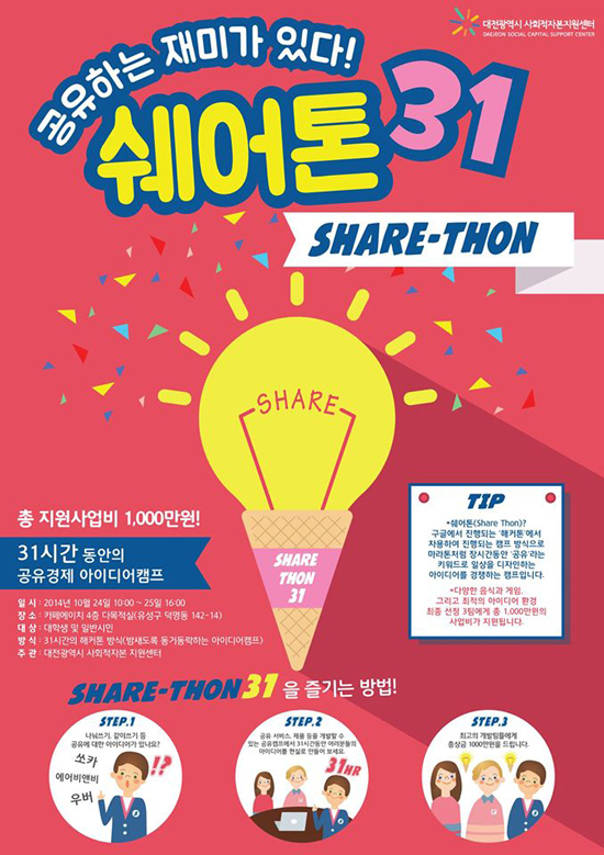 대전광역시 사회적자본지원센터는 대전지역 청년 단체들의 네트워크인 ‘청년고리’와 함께 오는 24일에 한밭대학교 맞은편 카페에이치에서 ‘쉐어톤 (Share-thon)31’이란 부제로 캠프를 진행한다. 쉐어톤이란 공유라(sharing)와 마라톤(marathon)이란 단어의 합성어로 마라톤처럼 장시간동안 ‘공유’라는 키워드로 일상을 디자인하는 아이디어를 경쟁하는 캠프이다.
