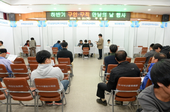 부여군(군수 이용우)은 지난 23일 여성문화회관 3층에서 취업의 기회 제공 및 맞춤형 일자리 마련을 위한 2014년 하반기 구인·구직 만남의 날 행사를 개최했다.