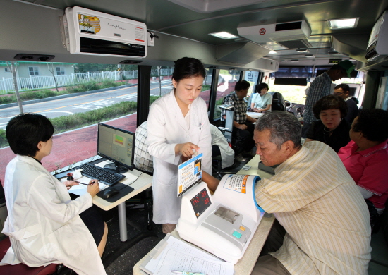 ▲ 유성구는 지난 2012년부터 지역을 돌며 주민들을 대상으로 혈압과 혈당, 콜레스테롤, 체성분 분석 등 건강측정과 건강상담 서비스를 제공하는 건강100세 버스를 운영하고 있다.