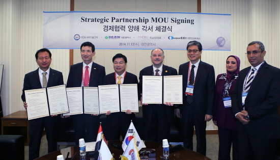 권선택 대전시장이 WTA총회 기간 중인 12일 오전 10시 DCC VIP룸에서 대한상공회의소-이노비즈협회-이집트과학단지(SRTA-CITY)와 함께 상호 경제협력을 위한 MOU를 체결하고 기념사진을 찍고 있다.