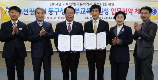 대전 동구(구청장 한현택)와 동부교육지원청(교육장 김연용)이 17일, 소회의실에서 자유학기제 확대시행과 2016년 전면 시행에 따른 자유학기제 운영 활성화를 위한 업무협약을 체결했다.