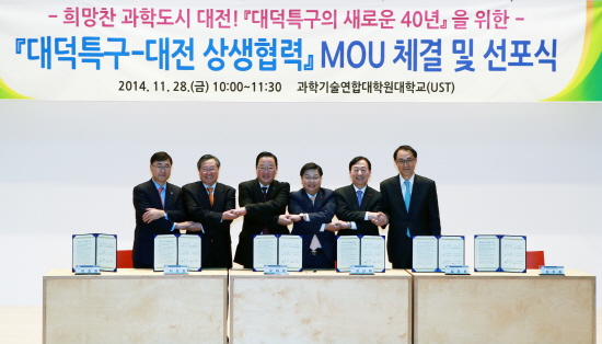 이날 대덕특구-대전 상생협력 MOU 체결은 대덕특구 내 출연(연), 국가기관, 정부투자기관, 기업(연) 등 40여 기관장과 시민, 지역 국회의원 등 300여명이 참석한 가운데 권선택 대전시장, 설동호 대전시 교육감, 이상천 국가과학기술연구회이사장, 김차동 연구개발특구진흥재단 이사장, 오태광 대덕연구개발특구 기관장협의회장(생명연 원장), 이승완 대덕이노폴리스벤처협회장이 대표로 MOU에 서명 했다.