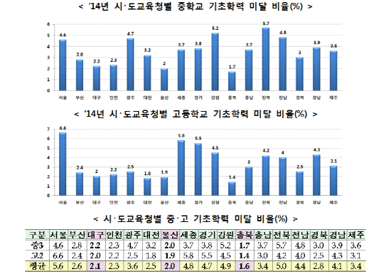2014년도 국가수준 학업성취도 평가는 지난 6월 24일(화)에 중3 및 고2 학생을 대상으로 국어, 수학, 영어 세 과목에 대하여 실시되었으며, 9월 초 응시 학생들에게 성취도평가 결과를 개별 통지한 바 있다. 올해의 평가 결과를 기초학력 미달 학생 비율과 보통학력 이상 학생 비율로 나누어 살펴보면 다음과 같다.