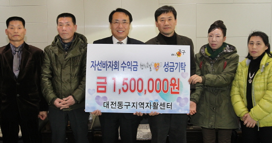 동구지역자활센터 자활근로사업 참여 주민들은 지난 11월 26일 대전보건대학교에서 진행한 <‘더’불어 ‘더’따뜻한 The 바자회> 수익금 150만원을 9일 동구의 대표적 나눔 복지브랜드인 ‘천사의 손길 행복+’에 기탁했다.