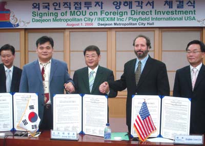 대전광역시는 1일 오전, 시청 대회의실에서 미국 기업인 INEXIM(대표 이성재)社와 Playfield International(대표 Stephen Lee Linville)社 등 2개 기업과 대덕테크노밸리 외국인투자단지에 총 1,400만 불을 투자하는 양해각서(MOU)를 체결했다.