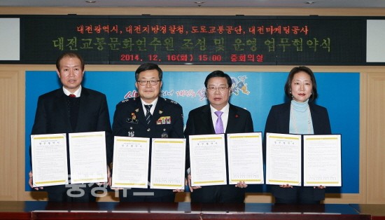 대전시는 16일 오후 3시 시청 중회의실에서 대전지방경찰청을 비롯해 도로교통공단, 대전마케팅공사 등 3개 기관과 ‘대전교통문화연수원’ 조성 및 운영을 위한 업무협약을 체결했다.