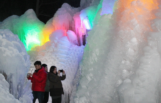 금년에 조성한 얼음동산은 지난해의 2배 규모로 확장한 300㎡ 정도로 넓게 꾸몄으며, 야간에 찾아오는 관람객을 위해 LED 조명을 활용한 환상적인 모습을 연출했다.