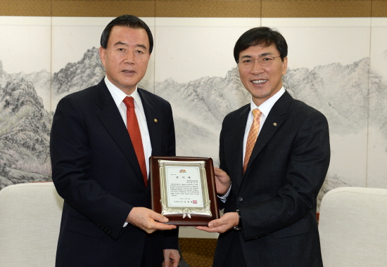 안희정 충남도지사는 29일 도청 접견실에서 홍문표 국회 예산결산특별위원회 위원장에게 감사패를 수여했다.