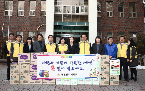 대전시의회(의장 김인식)는 연말연시를 맞아 29일 오전 10시 아동생활시설「평화의 마을(원장 : 신종근, 동구 가양동 소재)」 및 정신요양생활시설「우리누리(원장 : 한동우, 서구 장안동 소재)」을 방문하여 위문품을 전달하고 시설관계자들을 격려했다.