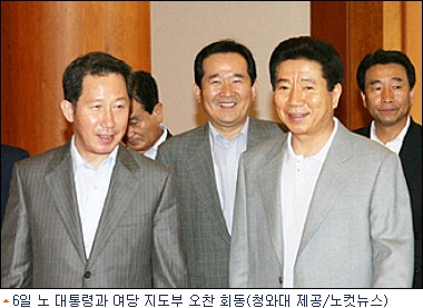 노무현 대통령은 6일 열린우리당 지도부와의 오찬회동에서 여당 대선후보 결정방식에 대한 구상의 일단을 내비쳤다. 외부인사를 영입해 경선으로 대선후보를 정하자는 것이다.
