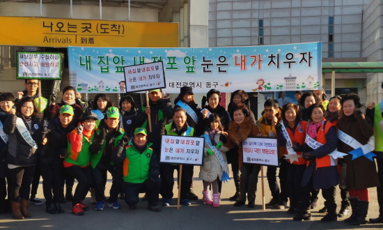 대전 동구(구청장 한현택)가 8일 대전역에서 안전모니터요원, 자율방재단 등 80여명이 모여 겨울철 화재 및 설해 등의 자연재난에 대비한 안전사고 예방을 주제로 2015년 첫 안전점검의 날 캠페인을 펼쳤다.