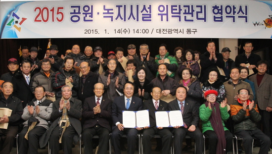 대전 동구(구청장 한현택)는 15일 ‘대한노인회 동구지회(지회장 강봉섭)’ 사무실에서 관내 공원녹지시설 48개소(32만6천㎡)를 대상으로 시설 인근의 경로당 노인회, 새마을부녀회 등 45개 주민단체와 ‘위탁관리 협약’을 체결했다.
