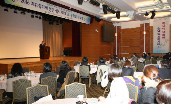 충남도교육청(교육감 김지철)은 19일 덕산 리솜스파캐슬에서 2016년 전면 시행되는 자유학기제에 대비해 초등학교 6학년 학부모와 중학교 1~2학년 학부모 600여명을 대상으로 연수를 실시했다.