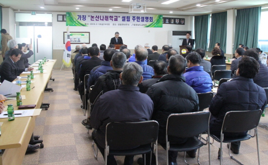 충남도교육청(교육감 김지철)은 13일 논산시 성동면사무소 회의실에서 성동면 지역주민 대표 56명과 송덕빈 충남도의원, 이계천․백승권 논산시의원 및 논산시청․성동면사무소 관계자 등 80여명이 참석한 가운데 가칭 ‘논산나래학교’ 특수학교 설립을 위한 주민설명회를 개최했다.