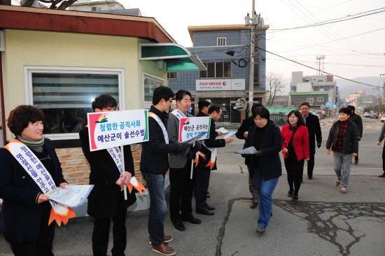 ▲ 예산군은 지난 10일 군청광장에서 군 직원 40여명이 설 명절 청렴캠페인은 실시했다
